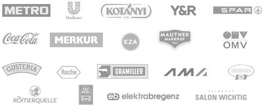 Werbung: METRO Cash and Carry Österreich GmbH - www.metro.at MERKUR Warenhandels AG - www.merkurmarkt.at EZA Fairer Handel GmbH - www.eza.cc SPAR Österreichische Warenhandels-AG - www.spar.at AMA Agrarmarkt Austria Marketing GesmbH - www.ama.at Kotányi GmbH - www.kotanyi.at VIVA, OMV Aktiengesellschaft - www.omv.at Y&R, Young & Rubicam - www.yr.com Gusteria, Concept Fresh VertriebsgesmbH - www.concept-fresh.at Römerquelle Trading GmbH - www.roemerquelle.at Franz Gramiller & Sohn GmbH - www.gramiller.at Mautner Markhof Feinkost GmbH - www.mautner.at Coca-Cola Österreich - www.coke.at Elektrag Bregenz, TV Spots - www.elektrabregenz.com ARGE Heumilch - www.heumilch.at Roche Austria GmbH - www.roche.at Salon Wichtig - www.salonwichtig.com Privatbrauerei Erzbergbräu - www.mountironbruery.com Unilever Austria GmbH - www.unilever.at Zeiler Gemüsevertrieb GmbH - www.tomaten.at REWE International AG - www.rewe-group.at Mondi - www.mondigroup.com Ströck Brot GmbH - www.stroeck.at Haas Food Equipment GmbH - www.haas.com Frisch & Frost Nahrungsmittel GmbH- www.frisch-frost.at Lidl Österreich - www.lidl.at Vi & Vie - www.viandvie.com Inzersdorfer - www.inzersdorfer.at McDonald's Österreich - www.mcdonalds.at binca group - binca-group.at Ströck-Brot GmbH- stroeck.at Baihu Foods - www.baihufoods.com Ottakringer Brauerei - www.ottakringerbrauerei.at XXXLutz KG - www.xxxlutz.at Wever & Ducré GmbH - www.weverducre.com mömax GmbH - www.moemax.at Dr. Schär AG - www.drschaer.com